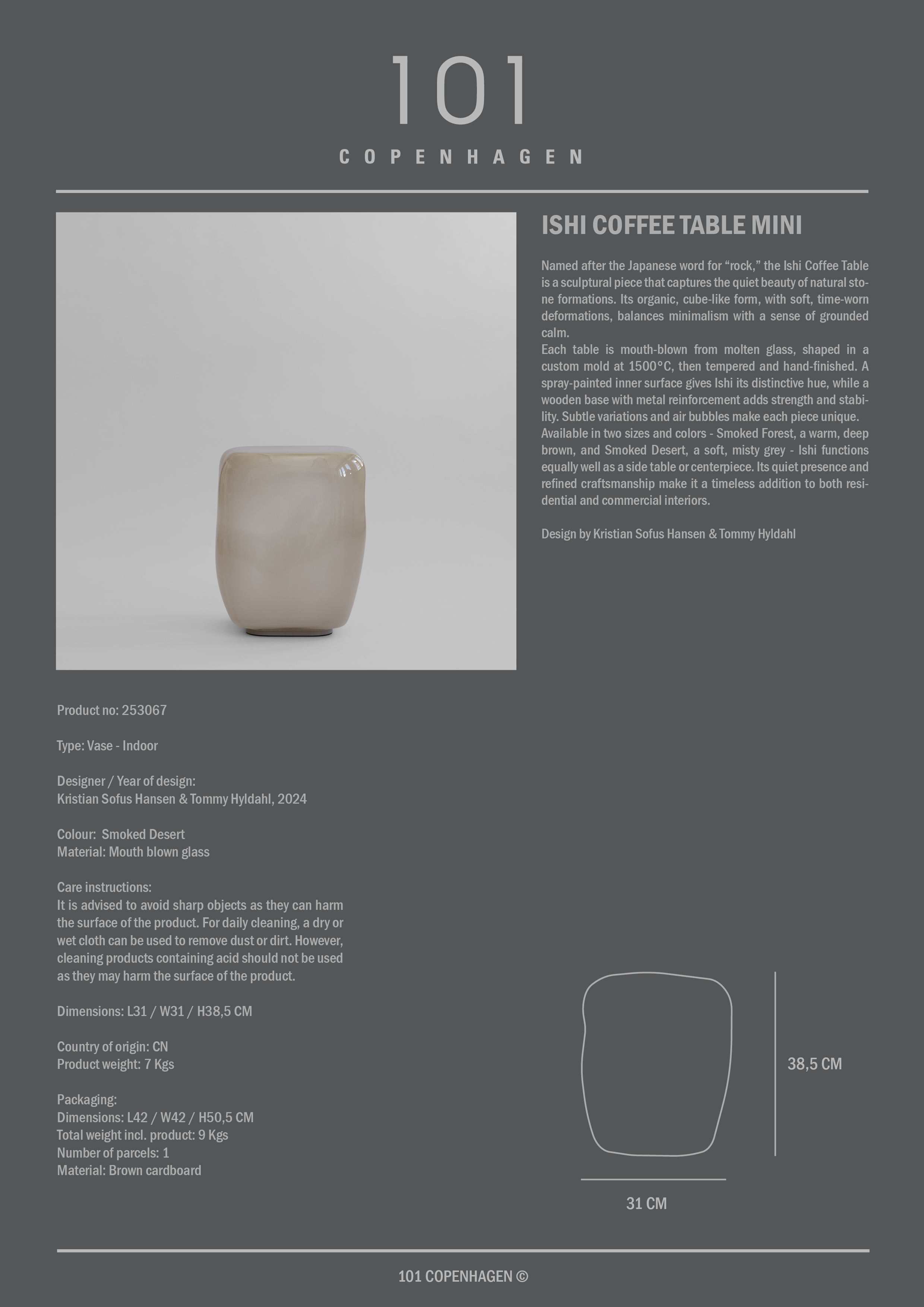 Ishi Coffee Table betyr stein på japansk og er et skulpturelt bord inspirert av naturlige fjellformasjoner. Den kubiske, organiske formen med myke deformasjoner kombinerer minimalisme med ro. Bordet er munnblåst glass, formet i en spesiell støpeform ved 1500 °C, herdet og håndbehandlet med spraymalt interiør og trebase med metallforsterkning. Små variasjoner og luftbobler gjør hvert bord unikt. Tilgjengelig i to størrelser og farger: Smoked Forest, en varm dyp brun, og Smoked Desert, en myk grå. Ishi fungerer som et sidebord eller midtpunkt og tilfører stilig håndverk til både private og offentlige rom. Designet av Kristian Sofus Hansen og Tommy Hyldahl.