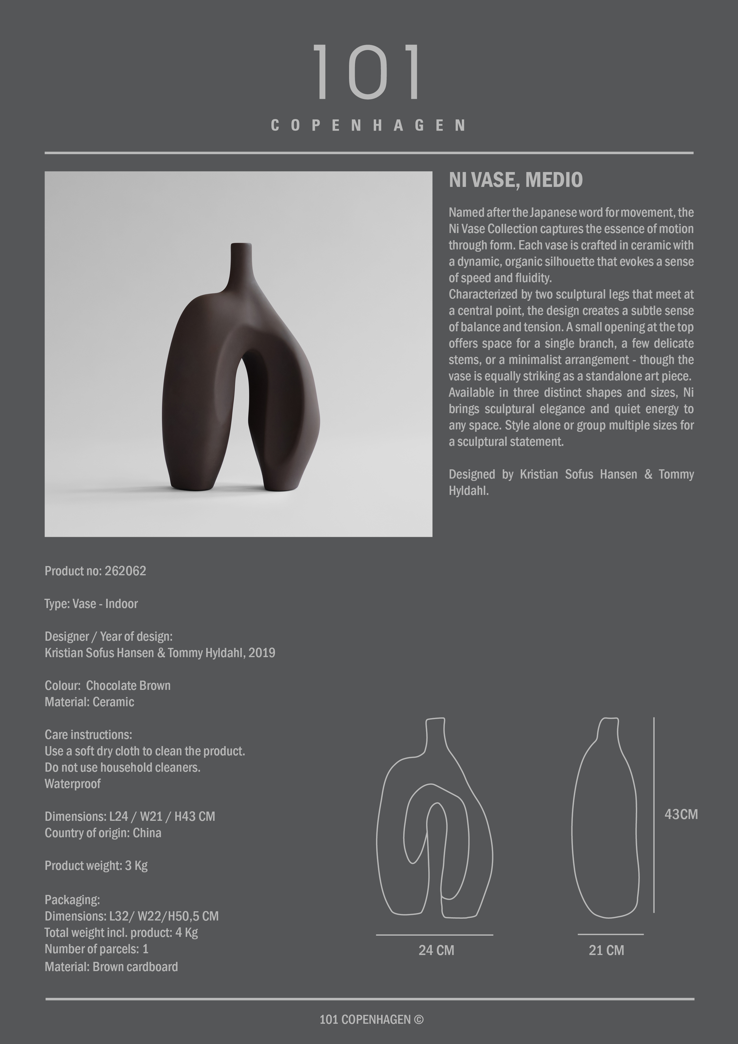 Ni-kolleksjonen har fått navnet sitt fra det japanske ordet for bevegelse og forteller historien om form fanget i stillhet. Hvert objekt begynner som håndformet leire og formes til organiske silhuetter som virker levende, som om de stoppes midt i et steg. Former og kurver leder tankene til å bevege seg over vann eller en dansers bevegelse i rommet. De skulpturelle beina møtes i et delikat balansepunkt, noe som gir objektene en nesten menneskelig tilstedeværelse. Sett fra forskjellige vinkler endrer formen karakter og avslører nye spenninger og linjer, mens den smale åpningen inviterer til enkle arrangementer eller til å la objektet stå alene som et kunstnerisk utsagn.
