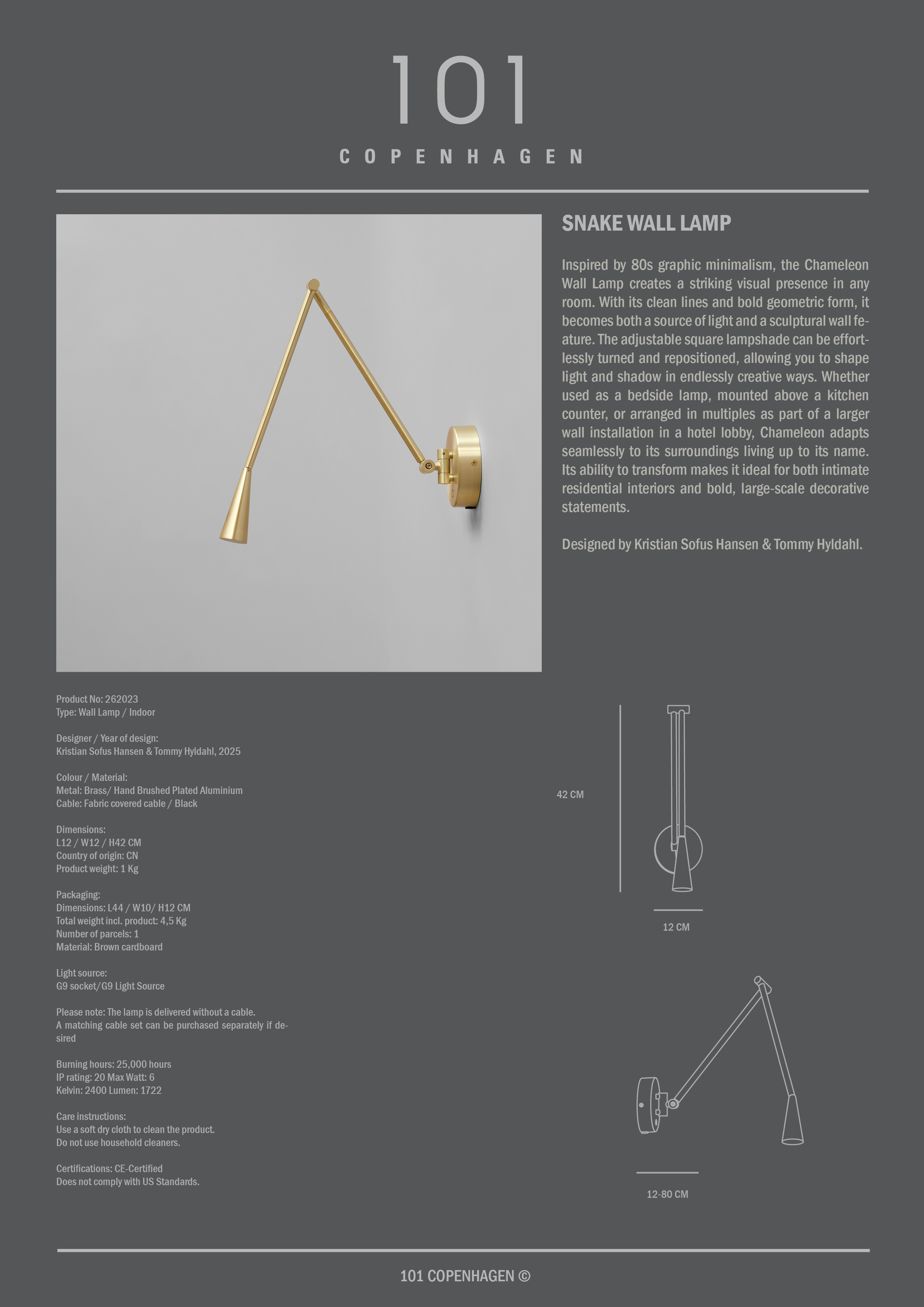 Snake er en studie av bevegelse og lys, der metall formes til en flytende, nesten levende linje i rommet. Inspirert av slangens stille og elegante bevegelse, slynger de slanke rørene seg med skulpturell presisjon og leder øyet mot de koniske skjermer, som utsender et varmt og behagelig lys. Formen fremstår i konstant bevegelse, selv når lampen står stille, og skaper et fint samspill mellom det kjølige metall og lysets myke glød. Snake tilfører rommet en rolig, men uttrykksfull tilstedeværelse, der lyset blir en del av arkitekturen og ikke bare en funksjon.