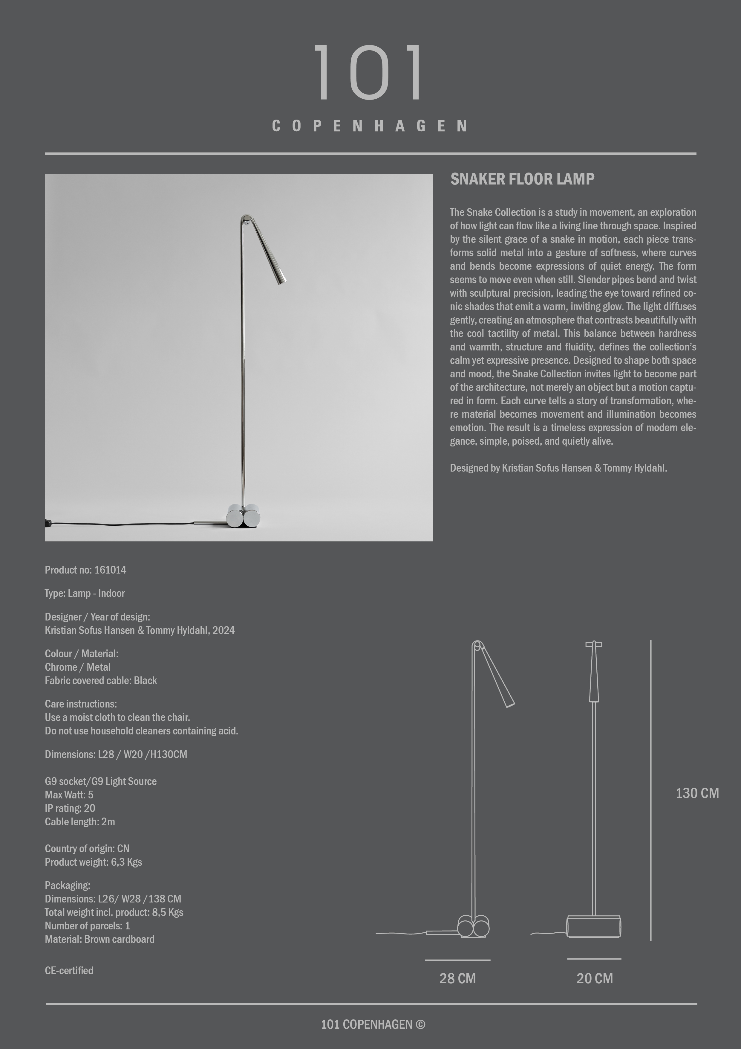 Snake er en studie av bevegelse og lys, der metall formes til en flytende, nesten levende linje i rommet. Inspirert av slangens stille og elegante bevegelse, slynger de slanke rørene seg med skulpturell presisjon og leder øyet mot de koniske skjermer, som utsender et varmt og behagelig lys. Formen fremstår i konstant bevegelse, selv når lampen står stille, og skaper et fint samspill mellom det kjølige metall og lysets myke glød. Snake tilfører rommet en rolig, men uttrykksfull tilstedeværelse, der lyset blir en del av arkitekturen og ikke bare en funksjon.