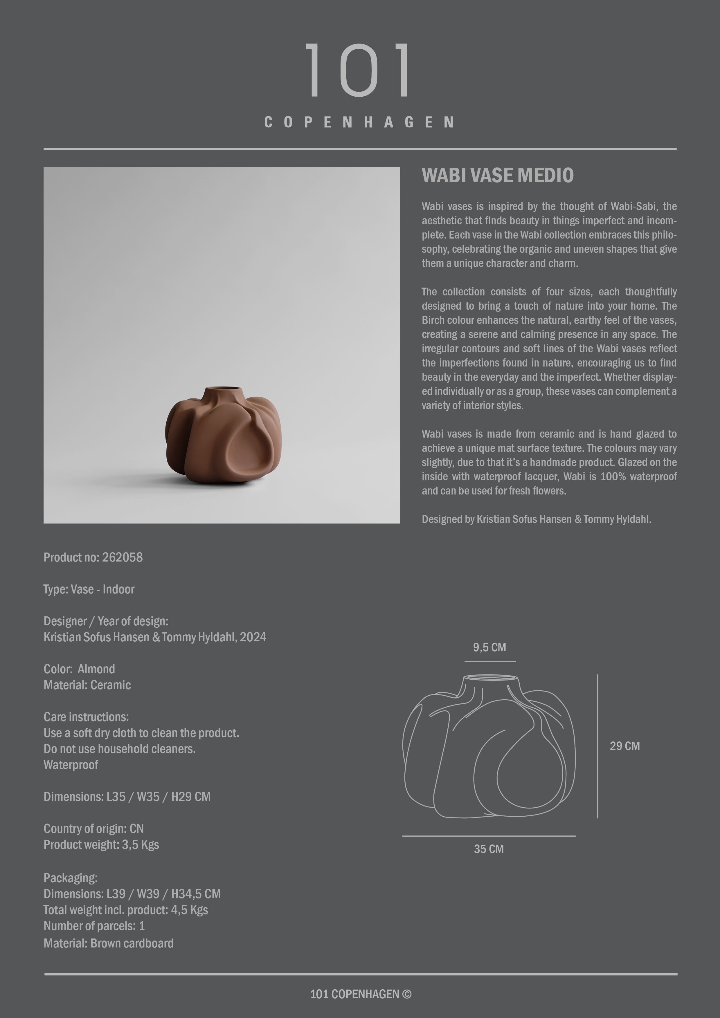 Wabi-serien stammer fra den japanske Wabi Sabi-filosofien, som finner skjønnhet i det uperfekte, det flyktige og det uferdige. Serien hyller de naturlige variasjonene i materialer og de små uregelmessighetene som vitner om menneskehånden og tidens gang. Kolleksjonen er laget i både håndmalt keramikk og munnblåst glass, og inneholder to forskjellige, men beslektede uttrykk – det ene mykt og taktilt, det andre lett og fullt av lys. Vasene varierer i høyde og proporsjoner, og sammen skaper de et harmonisk landskap der mangfold blir en styrke, og der ro og tilstedeværelse står i sentrum.