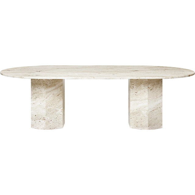 Epic-spisebordet fra Gubi er laget av solid naturstein og kjennetegnes av sin elliptiske bordplate og tunge, monolittiske struktur, hvor den hvite travertinen fremstår med åpne porer, fossile avtrykk og naturlige åremønstre, som varierer fra bord til bord og gjør hvert møbel unikt. Steinen er valgt for sine spesielle strukturelle egenskaper og bearbeidet med respekt for materialets opprinnelse, vekt og overflate, noe som gir bordet en særegen og kompromissløs karakter. Epic-serien er basert på klassiske arkitektoniske referanser og arbeider med rene geometriske former i solide materialer, hvor proporsjoner og tyngde er en integrert del av uttrykket. Spisebordet er en del av Epic-kolleksjonen og produsert av Gubi som et frittstående objekt i naturstein.