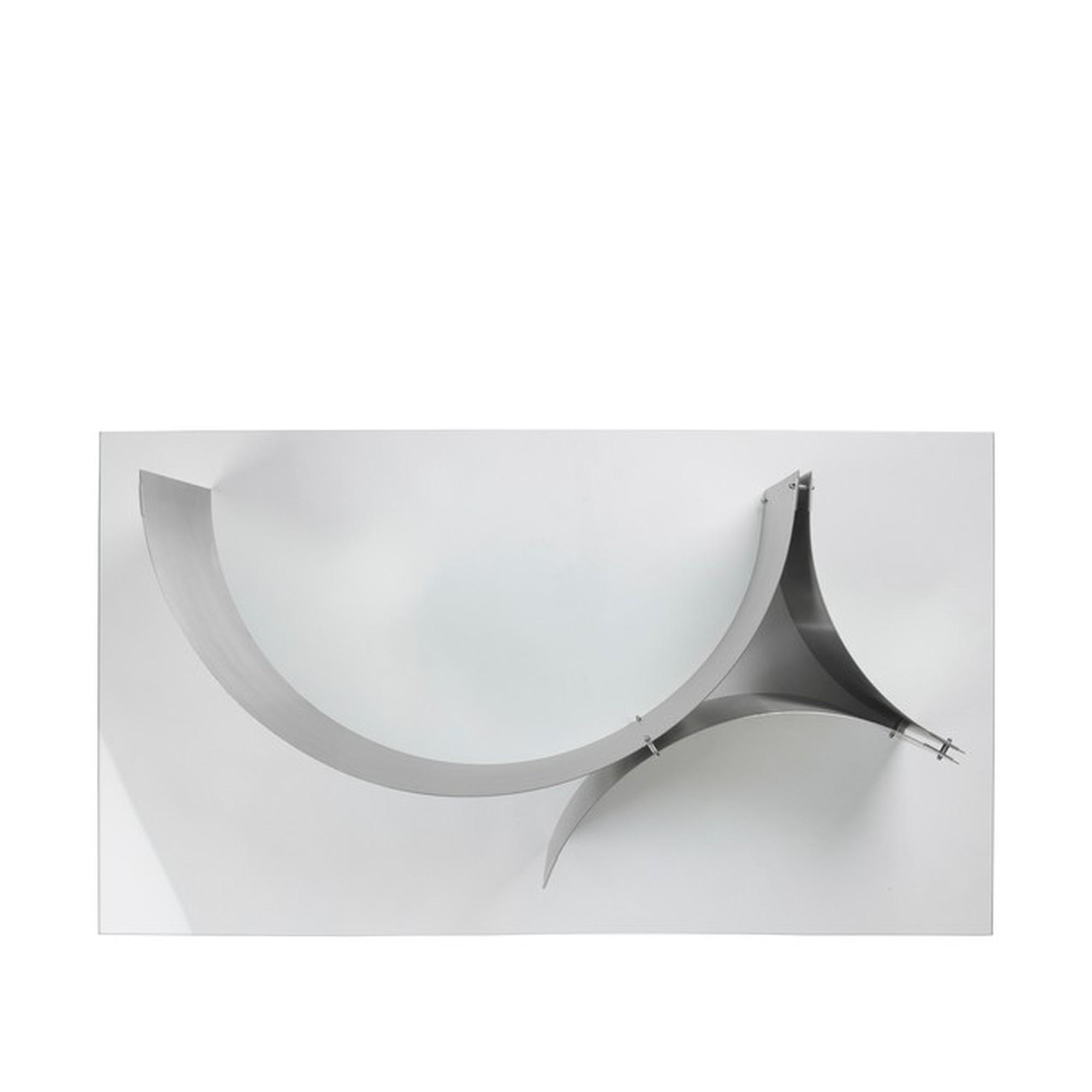 De buede panelene i rustfritt stål gir bordet en dempet, industriell karakter, mens lys og skygge beveger seg over overflaten og fremhever formens dybde. De synlige boltene understreker konstruksjonens ærlighet og gir det et teknisk, nesten arkitektonisk preg.