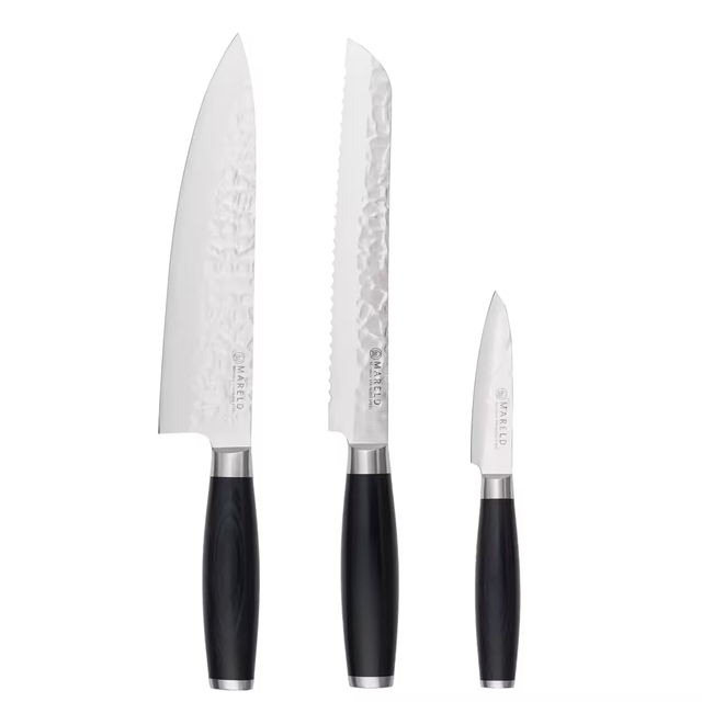 Oppgrader kjøkkenet ditt med Mareld Hammered Knife Set – et stilig og funksjonelt sett med tre essensielle kniver: en skrellekniv (9 cm), en kokkekniv (20 cm) og en brødkniv (20 cm). Knivene er laget av rustfritt stål 5Cr15MoV med en hardhet på 55–57 HRC, noe som gir en skarp, slitesterk og lett slipbar egg.