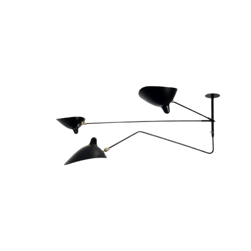 Denne lampen fra 1956 er et slående eksempel på Serge Mouilles lek med balanse og bevegelse. Kombinasjonen av faste og svingbare armer, rette og buede linjer, skaper et dynamisk uttrykk med stor visuell letthet. De justerbare aluminium gir fleksibel belysning, mens messingdetaljene tilfører varme og finesse. En lampe som kombinerer skulpturell tilstedeværelse med funksjonell eleganse – ideell for plassering der arkitekturen krever lys og karakter.