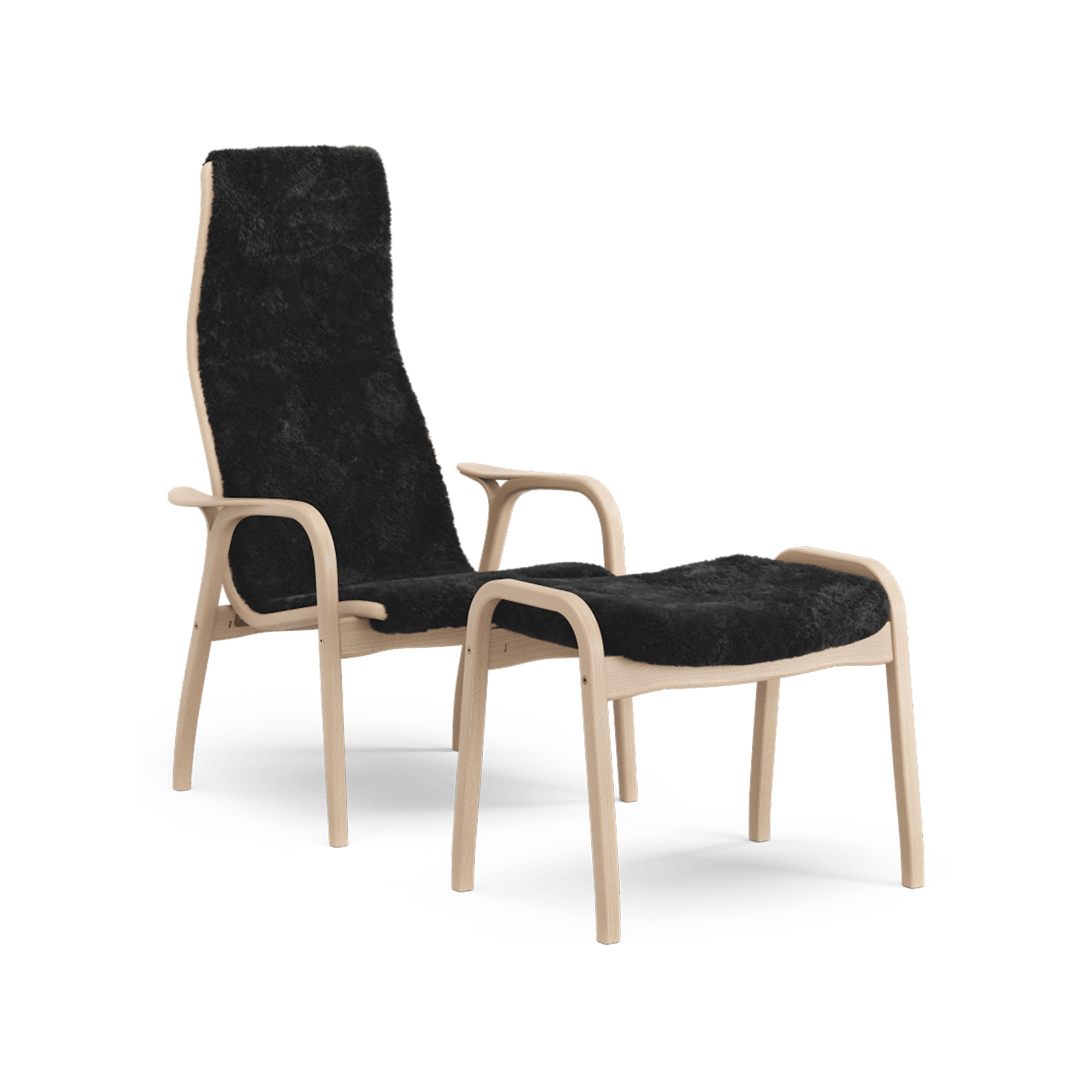 Swedese Lamino lenestol med fotskammel høy lakkert bøk eik/ Sort/saueskinn