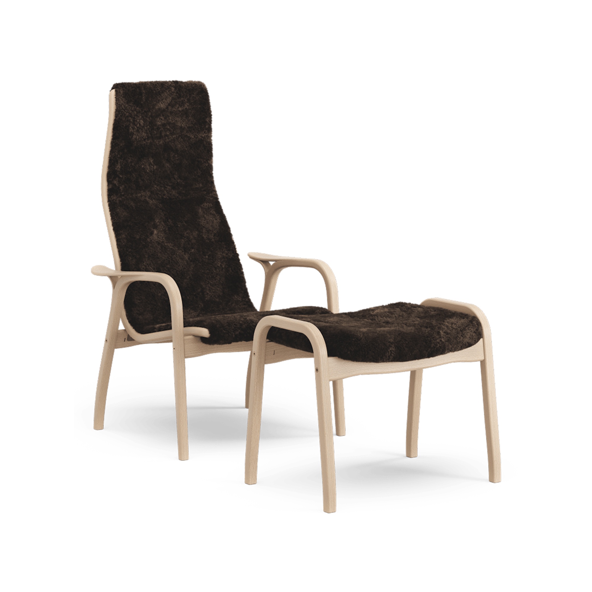 Swedese Lamino lenestol med fotskammel høy lakkert bøk eik/espresso/saueskinn
