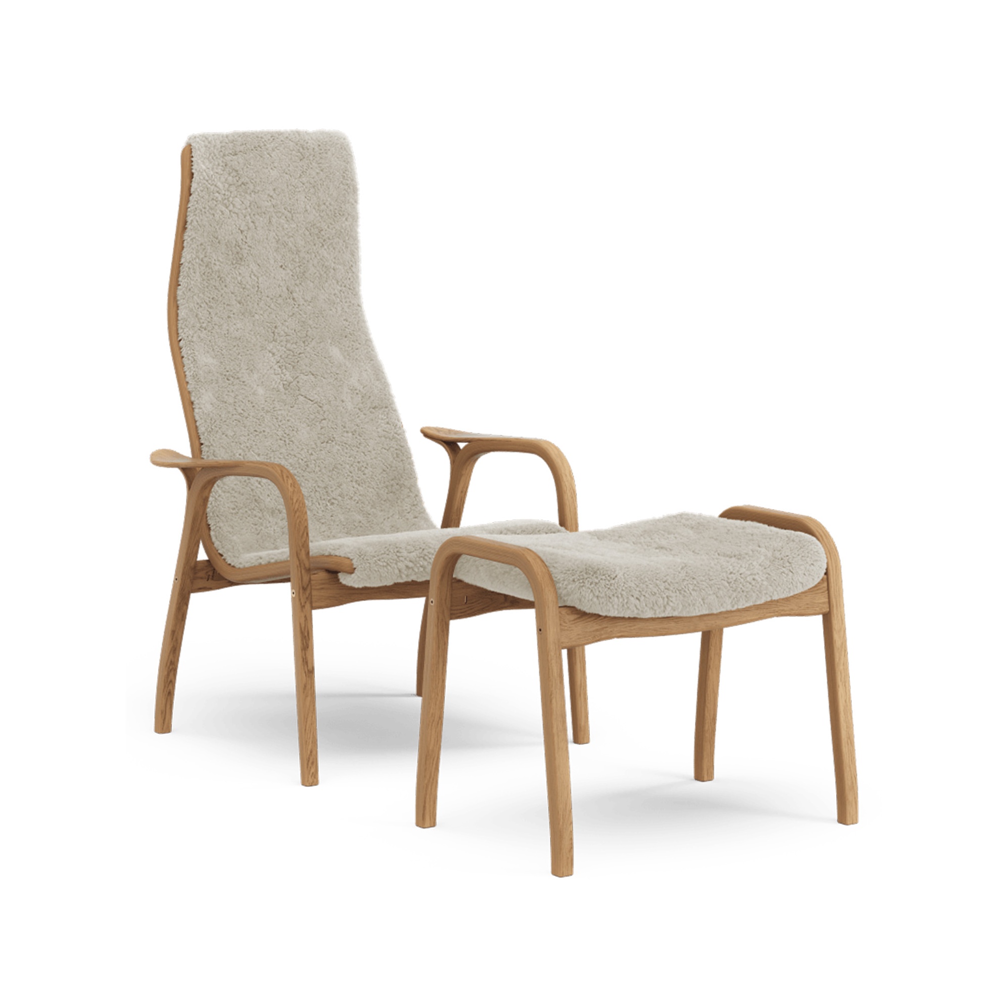 Swedese Lamino lenestol med fotskammel høyoljet eik/måneskinn/saueskinn