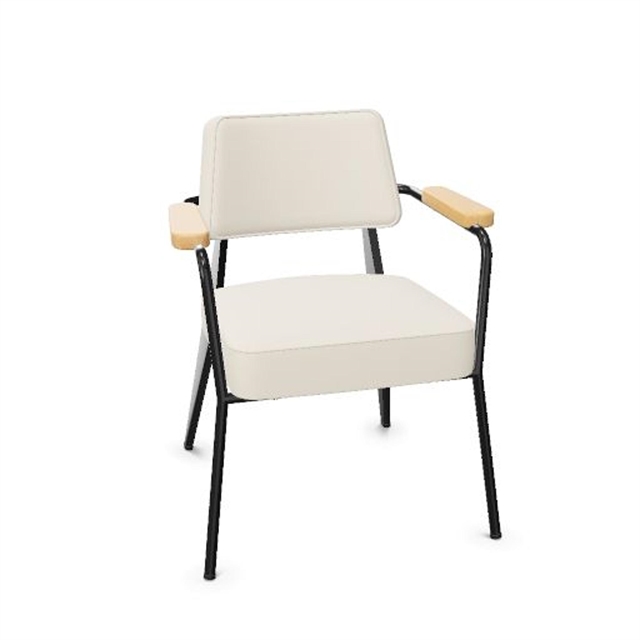 Vitra Fauteuil Direction Pivotant er en sofistikert spise- og arbeidsstol som kombinerer komfort med et særegent, designorientert utseende. Serien er bygget med en robust ramme og polstrede puter som gir optimal støtte, mens trearmlene tilfører varme og taktilitet til uttrykket. Stolen roterer lett rundt sin egen akse, noe som gjør den funksjonell i både møterom, hjemmekontorer og ved spisebordet. Fauteuil Direction Pivotant er laget med fokus på både ergonomi og estetikk og gir et raffinert, eksklusivt preg til moderne interiør.